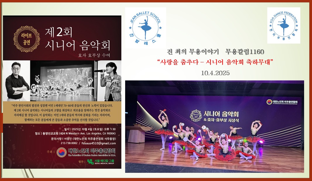 “ 폴 테일러 댄스 컴퍼니 ” 공연 리뷰 4.29.2023 ” Paul Taylor Dance Company” Performance Review By Jean Choi|2023-05-01T17:00:14-07:005월 1st, 2023|Categories: Videos, 동영상자료|“ 폴 테일러 댄스 컴퍼니 ” 공연 리뷰 4.29.2023 ” Paul Taylor Dance Company” Performance Review에 댓글 닫힘 관련 글 1160 . “사랑을 춤추다 – 시니어 음악회 축하무대” Gallery 1160 . “사랑을 춤추다 – 시니어 음악회 축하무대” 10월 16th, 2025 1155.“나는 왜 춤추는가? 발레로 기억하는 광복절” Gallery 1155.“나는 왜 춤추는가? 발레로 기억하는 광복절” 10월 13th, 2025 1155. “나는 왜 춤추는가? 발레로 기억하는 광복절” Gallery 1155. “나는 왜 춤추는가? 발레로 기억하는 광복절” 8월 22nd, 2025 1150. “발레로 전한 조용한 감동, 6.25 기념 실버발레와 아이들의 특별한 무대.” Gallery 1150. “발레로 전한 조용한 감동, 6.25 기념 실버발레와 아이들의 특별한 무대.” 6월 21st, 2025 1139. 예술로 불러낸 독립의 함성 “대한이 살았다.” 콜라보네이션 창작 공연 Gallery 1139. 예술로 불러낸 독립의 함성 “대한이 살았다.” 콜라보네이션 창작 공연 3월 5th, 2025