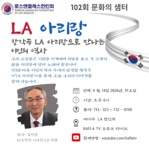 LA 한인회(회장 로버트 ) 1962 설립된 이후 지역사회와 함께 성장하며, 동포들의 권익 보호·교육·문화 진흥을 위해 다양한 프로그램을 지속해 왔습니다. ‘문화의 샘터 매달 둘째 화요일 열리는 대표 온라인 문화예술 강좌로, 지금까지 101회를 이어오며 한인사회의 문화적 역량을 높이는 중요한 역할을 해왔습니다.
